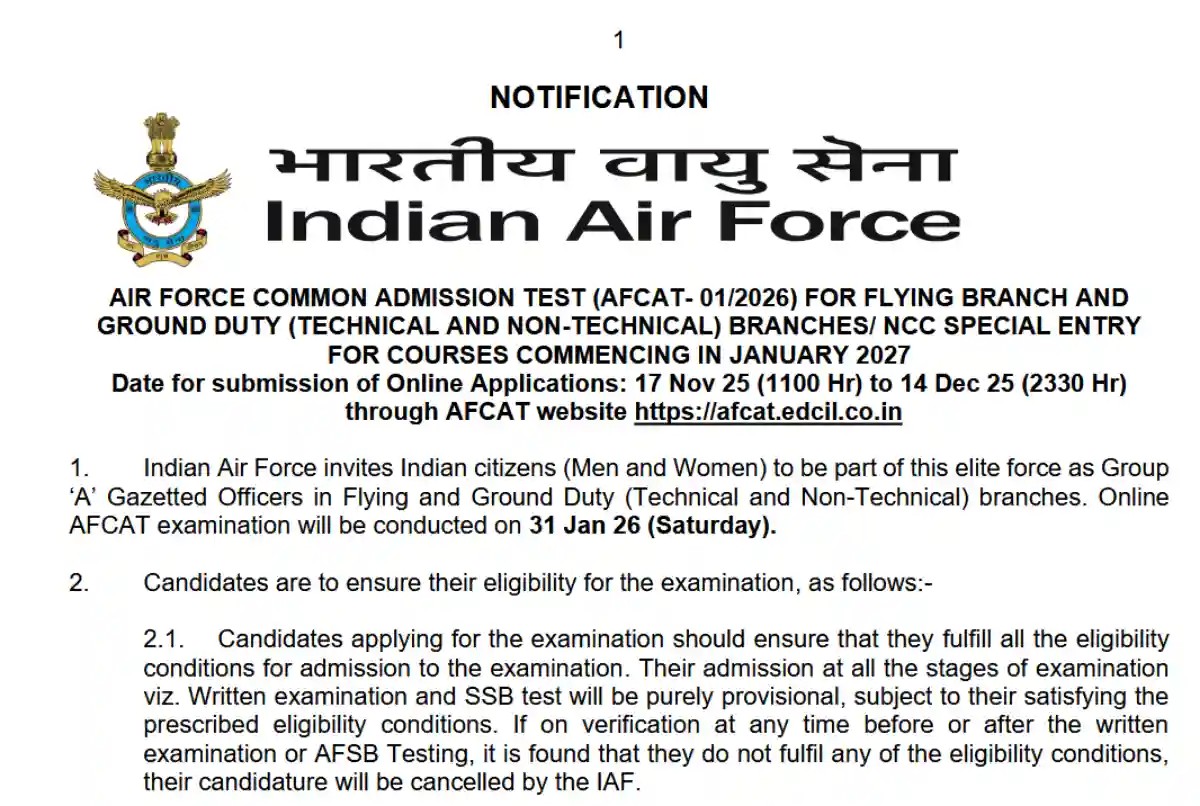 1. Indian Airforce ने AFCAT 01/2026 Batch Recruitment 2025 का नोटिफिकेशन जारी किया है।